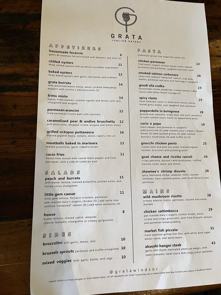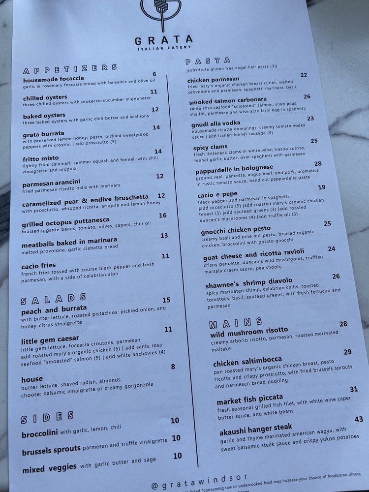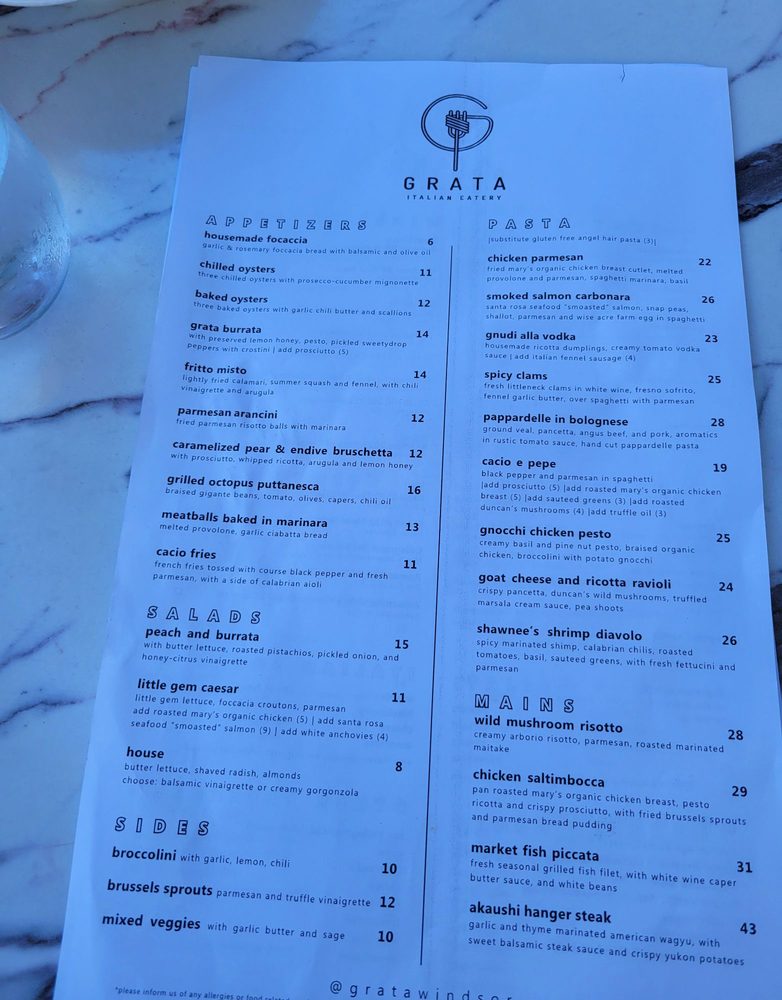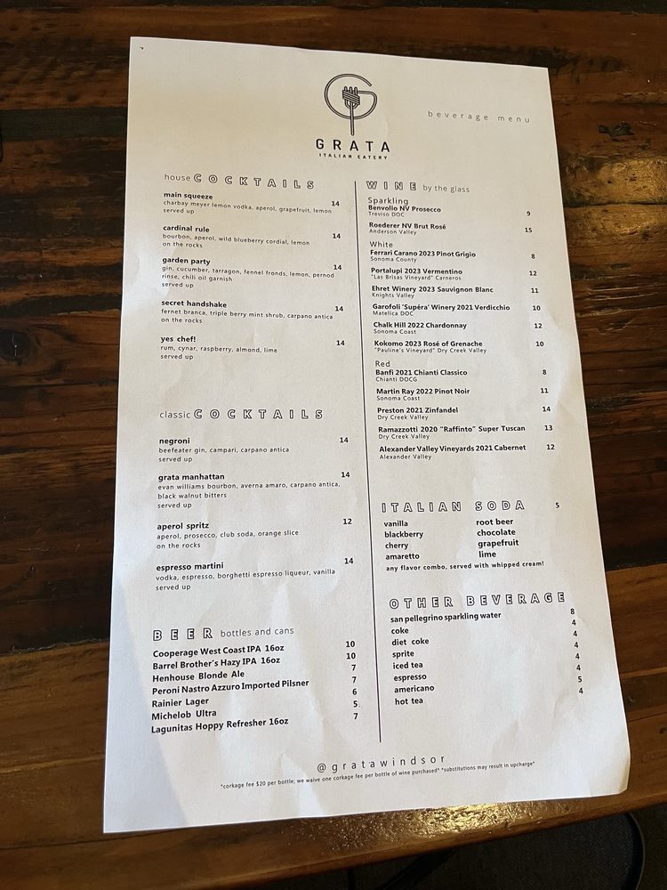 Introducing the menu at GRATA Italian Eatery, a cozy spot in downtown Windsor, featuring a range of Italian delights. The restaurant offers pescatarian and vegan options, with limited vegetarian choices available. From satisfying spaghetti to yummy cocktails and wine, there's something for everyone. Customers praise the attentive service and delicious dishes, like the hanger steak with potatoes and dad's chocolate cake. However, some diners note that the gluten-free pasta made with rice noodles may not be to everyone's taste. The restaurant also offers happy hour specials, full bar service, and outdoor seating, making it a versatile choice for a casual or upscale dining experience. With a warm atmosphere, thoughtful decor, and mouthwatering dishes, GRATA Italian Eatery is a must-visit in Sonoma for Italian food lovers.